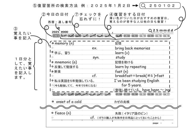 7. 復習を終えた日付には、チェックマークなどの目印をつけます。毎日今日の日付を検索し、チェックがついていない箇所(=まだ復習が終わっていない箇所)を繰り返し学習することで、効率的な記憶定着が期待できます。
