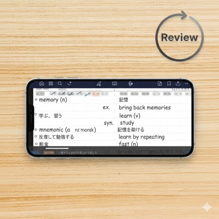 学んだことを忘れず、長期記憶に定着させるためには、「忘れる前の反復学習」がとても大切です。この効果的でシンプルな学習法をするためにこのデジタルノートフォーマットは最適です。復習のタイミングを教えてくれて、学習したことを長期記憶に定着させる手助けをしてくれます。